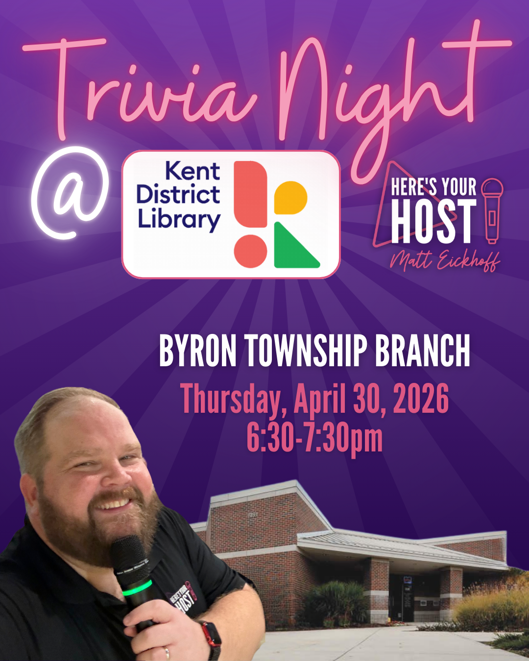 Matt is excited to continue the “Trivia Night @ KDL” series with Kent District Library! This is a free, in-person trivia show for adults! The April 2026 show will be at the Byron Township Branch.